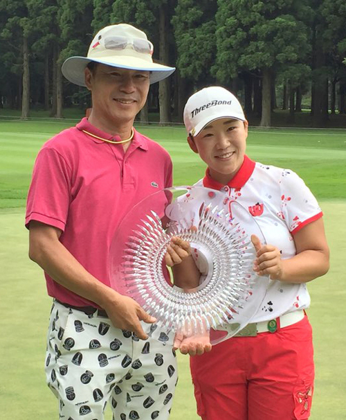 | 신지애(오른쪽)가 19일 일본 지바현 지바시 소데가우라 컨트리클럽에서 열린 JLPGA 투어 니치레이 레이디스에서 우승한 뒤 아버지와 함께 트로피를 들고 환하게 웃고 있다. 세마스포츠마케팅 제공 |