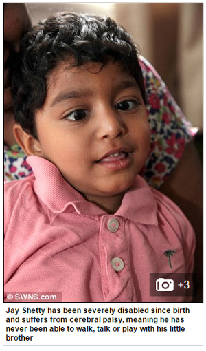 지난 20일(현지시간) 영국 일간 데일리메일 등 외신들에 따르면 잉글랜드 런던에 사는 제이 셰티(5)는 태어나자마자 뇌성마비 진단을 받았다.