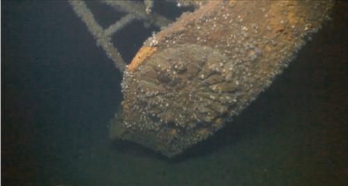 | 태평양전쟁 말기 침몰한 일본 전함 야마토의 수중 촬영 사진. 왕실의 국화문양이 선명하게 포착됐다. |