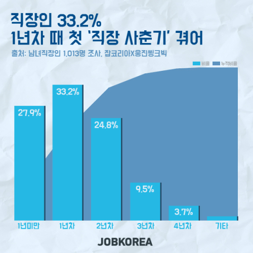 직장 사춘기가 처음 찾아온 시기는 ‘신입직 입사 후 1년차’ 때라는 직장인이 33.2%로 가장 많았다. 이어 ‘1년 미만’ 때 직장 사춘기를 겪었다는 직장인도 27.9%로 많았다.