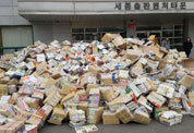 | 중소출판사들이 주로 모여 있는 세종벤처타운 마당에 어른 키 높이로 쌓여있는 책더미. 매주 폐기물 처리 차량에 실려 재활용 처리시설로 운송된다. |