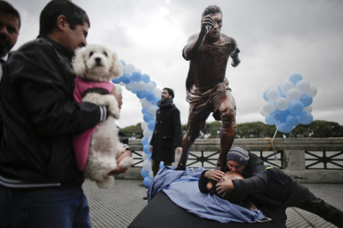 | 아르헨티나의 축구팬이 28일(현지시간) 부에노스아이레스에서 제막된 메시의 실물 크기 동상에 입맞춤 세례를 하고 있다. 부에노스아이레스=AP연합뉴스 |