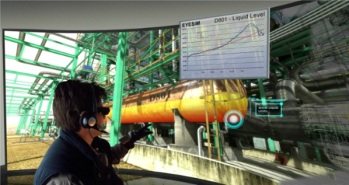 | 작업자가 VR 트레이닝 시뮬레이터로 구현한 작업 환경에서 훈련 받고 있는 모습. 사진=슈나이더 일렉트릭 |