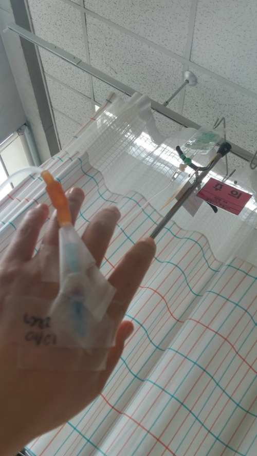 | 이윤희씨는 유방암 치료 이후 원인 모를 근육통으로 수없이 병원 신세를 져야 했다. 이씨는 “아플 때 찍은 거의 유일한 사진”이라며 링거를 맞고 있는 손 사진을 보내 왔다. 이윤희씨 제공 |
