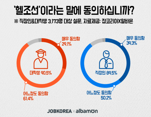 잡코리아와 알바몬의 공동 설문에서 직장인 및 대학생의 약 90%가 ‘헬조선이란 말에 동의한다’고 답했다. 구체적으로 살펴보면 ‘어느 정도 동의한다’가 55.0%로 가장 많았으며 ‘매우 동의한다’도 34.9%로 적지 않았다. ‘그다지 동의하지 않는다(8.2%)’ 및 ‘전혀 동의하지 않는다(1.9%)’는 10% 수준에 그쳤다.