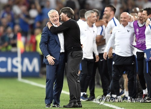 | 독일의 요아힘 뢰브 감독이 프랑스의 디디에 데샹 감독에게 축하의 인사를 하고 있다. |