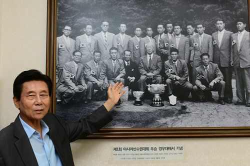 | ‘‘영원한 축구 감독’ 김정남씨가 최근 서울 효장구장 내 한국OB축구회 복지관에 걸려 있는 기념사진 앞에서 1956년 제1회 아시아축구선수권대회에 출전한 선배들의 이름을 일일이 호명하고 있다. 당시 이승만 대통령(앞줄 왼쪽 다섯번째)은 우승하고 개선한 선수단을 경무대로 초청해 격려했다. 남정탁 기자 |