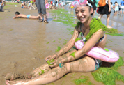 아이들은 진흙탕에 엎드린 채 손발을 휘저었다. 수영복 차림에 튜브를 낀 여성은 몸에 녹조를 바르고는 환한 표정을 지었다. 상의를 탈의한 한 남성도 다른 이들을 따라 하는 듯 어깨와 팔 등에 녹조를 바른 채 웃음을 터뜨렸다.