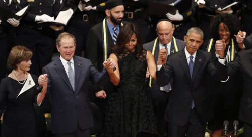 | 손에 손 잡고 통합 강조 12일(현지시간) 흑인 저격범에 의해 피살된 백인 경찰관들의 추모식이 열린 미국 댈러스주의 모튼 H 메이어슨 심포니 센터에서 미국 버락 오바마 대통령과 조지 W 부시 전 대통령 부부가 손을 잡고 미국의 통합을 촉구하고 있다. 왼쪽부터 로라 부시, 부시 전 대통령, 미셸 오바마, 오바마 대통령. 댈러스=AP연합뉴스 |