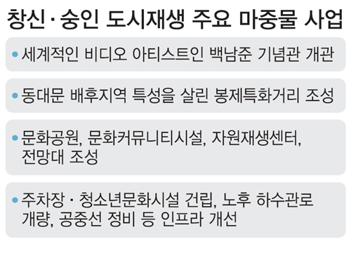 서울시는 종로구 창신·숭인 지역에 12개 마중물 사업과 중앙부처 협력사업 등 25개 도시 재생사업을 본격화한다고 20일 밝혔다. 창신·숭인은 사업 부진 때문에 2013년 가장 먼저 해제된 뉴타운으로 이후 2014년 서울에서 유일하게 국토부 선정 전국 13개 도시재생선도지역에 포함됐다. 시는 이에 기반해 지난해 2월 활성화계획을 세웠다.