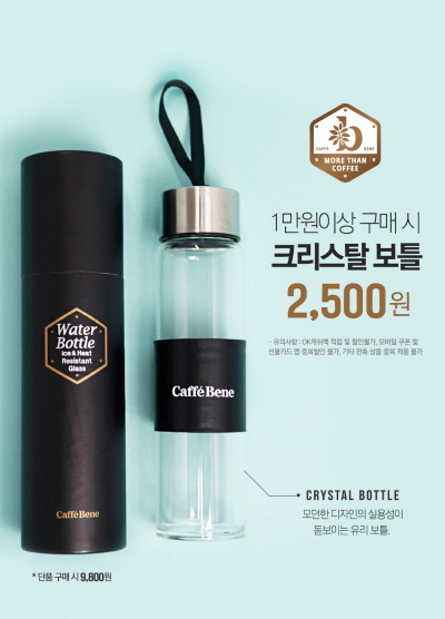크리스탈 보틀은 친환경 유리 소재에 모던한 디자인으로 사랑을 받고 있는 제품이다. 450ml의 넉넉한 용량을 자랑하는 유리 소재 본체에 카페베네의 로고가 새겨진 블랙 컬러의 바디링이 포인트로 들어가 세련미가 강조됐다.