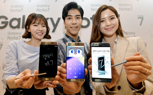 | 11일 서울 서초구 삼성전자 서초사옥 다목적홀에서 모델들이 ‘갤럭시 노트7’을 선보이고 있다. 하상윤 기자 |