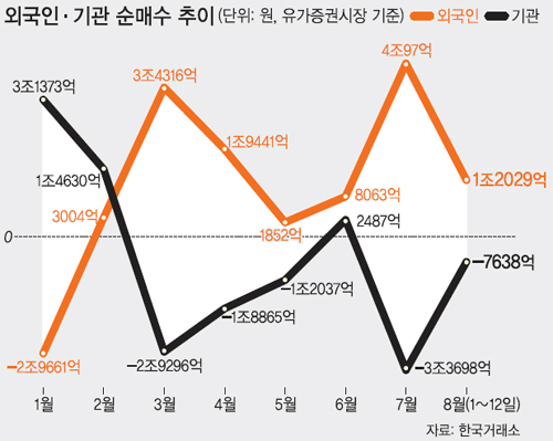 14일 한국거래소에 따르면 외국인은 유가증권시장에서 이달 1일부터 지난 12일까지 1조2029억원 순매수를 나타내고 있다. 외국인은 올해 초부터 한국 주식을 사들이고 있다. 브렉시트(영국의 유럽연합 탈퇴)를 둘러싼 정치적 불안 탓에 5월과 6월 매수세가 주춤하긴 했으나 그래도 매도보다 매수가 많았다. 7월에는 4조97억원이나 사들였다. 이에 반해 기관은 1, 3, 6월을 제외하고 순매도를 기록했다. 기관은 이달 들어서도 12일까지 유가증권시장에서 7638억원어치를 팔았다.