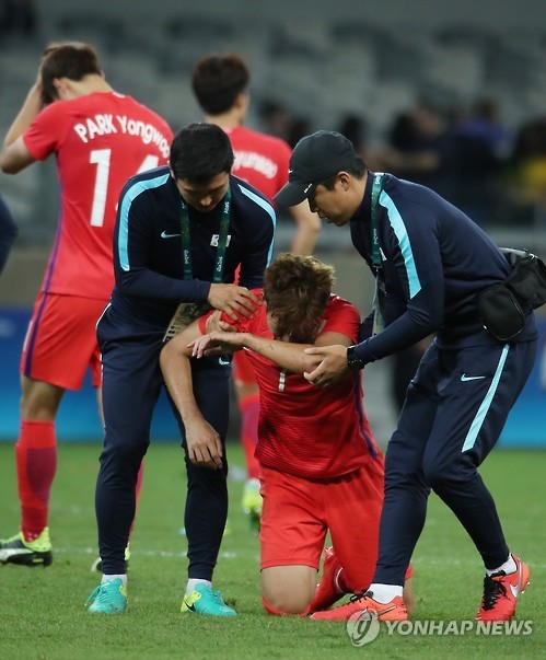| 13일(현지시간) 오후 브라질 벨루오리존치 미네이랑 경기장에서 열린 리우올림픽 축구 8강전 한국과 온두라스의 경기에서 1대0으로 패한 한국의 손흥민이 경기 후 그라운드에 누워 울다가 코칭 스태프들의 부축을 받으며 일어나고 있다. |