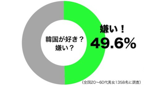 조사에 따르면 "한국이 싫다"고 답한 사람은 49.6%로 "좋다"·"어느 쪽도 아니다"라고 응답한 사람을 합한 것과 0.4%포인트 차이를 나타냈다.
