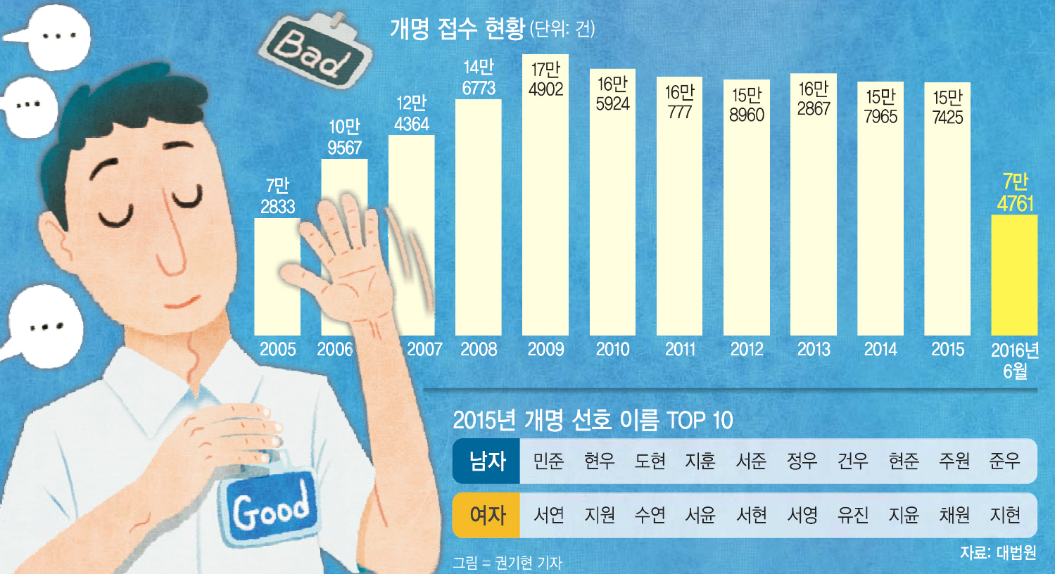 22일 대법원에 따르면 개명 신청은 2005년 7만2000건에서 이듬해 10만9000건으로 늘었고, 2009년 이후에는 해마다 15만∼17만건에 이른다. 10년(2006∼2015년)간 개명을 신청한 사람만 151만9524명으로 국민 약 34명 중 1명꼴이다.