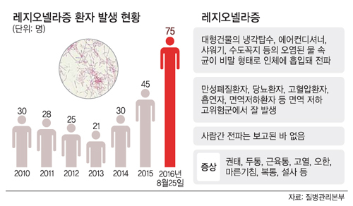감염자는 두통, 근육통, 오한, 복통 등의 증상을 보인다. 최근 몇 년간 한 해에 30명 내외의 환자가 발생했지만 올해 이달 25일까지 75명이 감염되는 등 급증세다. KCDC는 균이 허용 범위 미만으로 떨어질 때까지 투숙객 입실을 제한하고 급수시스템 점검 및 소독을 실시할 예정이다.