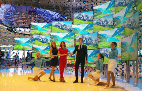 | 환상의 ‘퀀텀닷 병풍’ 독일 베를린에서 열릴 ‘국제 가전전시회(IFA) 2016’을 하루 앞둔 1일 IFA걸(왼쪽 세번째)과 삼성전자 모델들이 삼성전자의 퀀텀닷 SUHD TV를 소개하고 있다. 삼성전자 제공 |