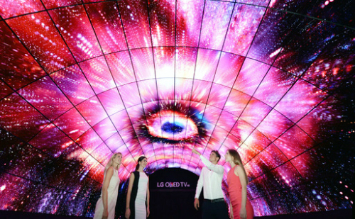 | 명물된 올레드 터널 LG전자가 1일(현지시간) 올레드 사이니지 216대를 이용해 베를린의 ‘IFA 2016’ 전시관 앞에 설치한 너비 7.4m, 높이 5m, 길이 15m 규모의 초대형 올레드 터널을 모델들이 소개하고 있다. LG전자 제공 |