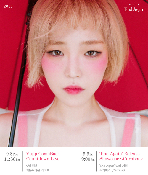 가인은 9일 새 앨범 '엔드 어게인(End Again)' 을 발매, 이를 기념하여 전날 밤 11시 30분 네이버 V앱 '브라운 아이드 걸스' 채널을 통해 '카운트다운 라이브'를 생방송으로 진행한다.
