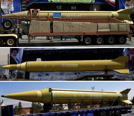 | 이란의 샤하브-3 탄도미사일. 탄두 형태가 다른 버전이 3개 있다. 그 중 가운데와 맨 아래 미사일은 탄두 모양이 각각 노동미사일과 지난 5일 북한이 발사한 미사일과 거의 일치한다. 북한과 이란이 미사일기술을 교류하고 있다는 방증이다. |
