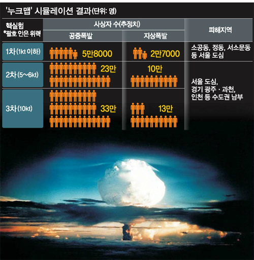 세계일보가 지난 3월 국내 언론사 중 최초로 미국 민간연구기관 ‘스티븐스 인스티튜트 테크놀로지’ 시뮬레이션 프로그램 ‘누크맵’(NUKEMAP)을 통해 분석한 결과 북한이 서울에 10kt의 핵폭탄을 투하하면 13만~33만명의 사상자가 발생하는 것으로 드러났다. 폭발 중심지인 서울시청 일대는 초토화하고 소공동과 서소문 일대 건물 대부분이 무너지는 것으로 나타났다. 바람이 남쪽으로 불면 안국동, 가회동, 충정로 등에 거주하는 시민은 치사율이 50~90%인 방사능 피해를 입고 경기도 광주, 이천, 과천, 부천, 인천까지 여파가 미쳐 수도권 남부지역이 사실상 마비상태에 빠지는 것으로 분석됐다.