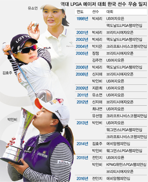 1998년 LPGA투어에 데뷔한 한국 여자프로골프의 선구자인 ‘레전드’ 박세리(39·하나금융그룹)가 데뷔 첫해에 맥도날드 LPGA 챔피언십과 최고 권위의 US여자오픈을 제패하면서 태극 낭자들의 우승 물꼬를 텄다. 이후 2008년 LPGA에 데뷔한 박인비(28·KB금융그룹)가 2008년 US오픈을 제패하면서 태극 낭자들의 메이저 대회 우승은 끊임없이 이어졌다.