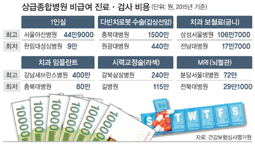 치과 보철(금니)료는 삼성서울병원이 106만7000원으로 전남대병원(17만70000원)의 6배가 넘었다. 임플란트 비용은 강남세브란스병원(400만원)이 충북대병원(80만원)의 5배였다.