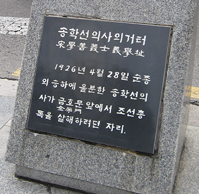 창덕궁 돈화문에 1995년 설치된 기념표석 자리는 송학선 의사의 금호문 의거 현장이다.