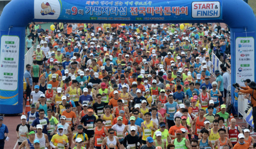 | 25일 오전 경기 가평종합운동장에서 가평군과 세계일보 공동주최로 열린 ‘제9회 가평 자라섬 전국 마라톤대회’에서 하프코스 참가자들이 힘차게 출발하고 있다. 가평=하상윤 기자 |