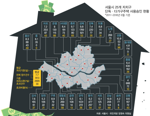 26일 서울시가 국회 안전행정위원회 소속 국민의당 장정숙 의원에게 제출한 ‘서울시 자치구별 단독·다가구주택 사용승인 처리기간’ 자료에 따르면 자치구별 처리기한이 최대 3배 이상 차이가 났다.