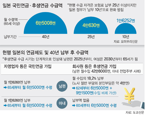 이번 개정안이 시행되면 자영업자 등 국민연금 가입자 40만명과 회사원 등 후생연금 가입자 24만명이 혜택을 받게 될 전망이다. 국민연금에 10년 동안 보험료를 낸 가입자의 경우 40년 납부자의 수령액인 월 6만5008엔(약 71만9800원)의4분의 1에 해당하는 월 1만6252엔을 받게 된다. 예산은 내년에 약 260억엔, 이후 연간 650억엔이 필요한 것으로 일본 정부는 추산하고 있다.