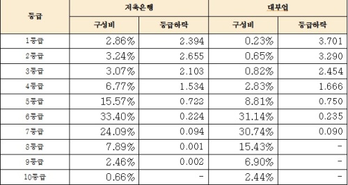 반면 대부업과 저축은행을 가장 많이 이용하는 5~8등급의 중저신용자는 하락폭이 평균 0.09∼0.7등급에 그쳤다.