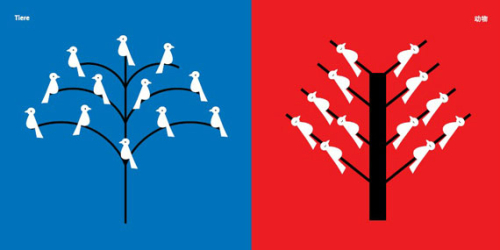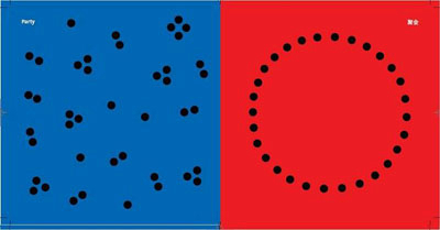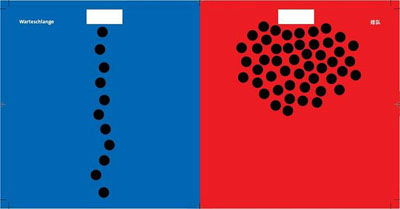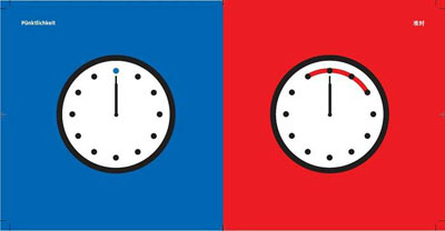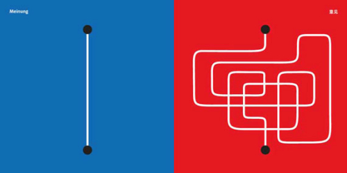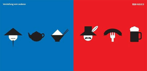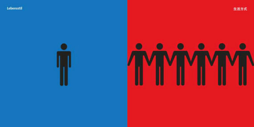 다음은 양 리우 웹사이트와 인디펜던트, 비주얼뉴스닷컴, 슬라이드쉐어닷넷 등에서 소개한 주요 작품들이다. 파랑색은 서양(독일)이고 빨간색은 동양(중국)이다. 일상과 대인관계 등에 있어 극명한 동서 간 차이를 표현했다. 잊지 말아야 할 것은 작가의 당부말처럼 다음 그림들은 개인적 의견일 뿐이지 "100% 그렇다"고 할 수는 없다는 점이다.