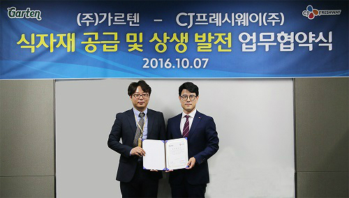 | 홍순일 CJ프레시웨이(오른쪽)상무와 가르텐 ㈜가르텐 대표이사(왼쪽)이 7일 `식자재 공급 및 상생발전 업무협약`을 체결했다. 사진=CJ프레시웨이. |