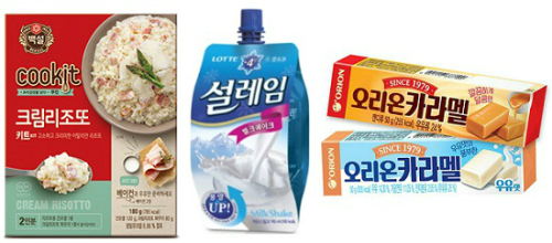 | (왼쪽부터) CJ제일제당 백설 `크림리조또`, 롯데제과 `설레임`, 오리온 `오리온카라멜`. 각각 `리소토`, `설렘`, `캐러멜`로 쓰는 게 바른 표기법이다. 사진=각사. |