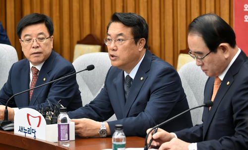새누리당 정진석 원내대표(가운데)가 11일 오전 국회에서 열린 국정감사 대책회의에서 모두발언을 하고 있다. 왼쪽부터 김광림 정책위의장,정 원내대표, 박명재 사무총장. 이재문 기자 |