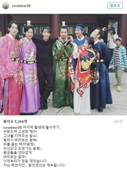 김산호는 17일 자신의 인스타그램에 "마지막 촬영 때 몰아주기. 비 맞으며 고생한 해수! 그녀를 지켜주는 왕소! 멀리서 바라보는 왕욱! 무릎 꿇는 백아! 왕정! 우산 갖고 도망가는 왕원! 동생들을 안타깝게 바라보는 왕무! 이제부터가 정말 재밌습니다. 저는 죽었지만 달의연인은 계속됩니다!"라는 글과 함께 한 장의 사진을 게재했다.