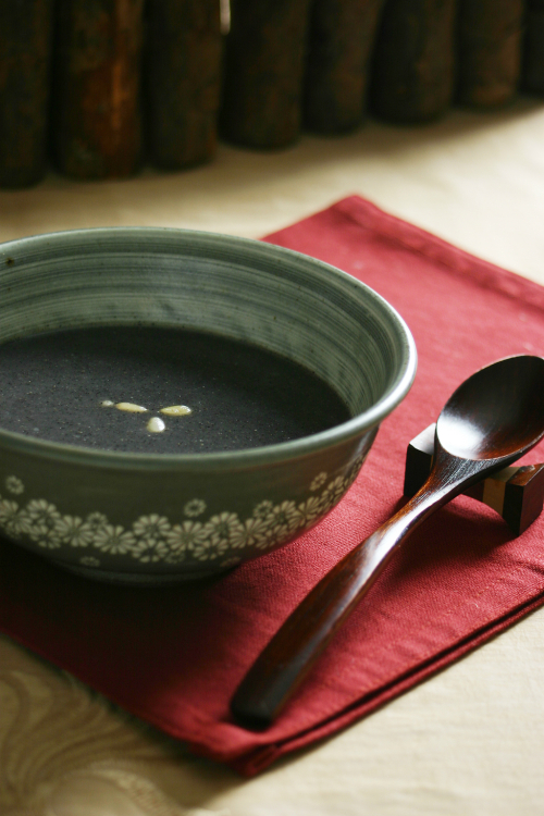 | ■흑임자죽 재료- 검은깨 1/2컵, 불린 쌀 1컵, 물 5컵, 소금 만드는 법 ① 검은깨는 손으로 깨끗이 씻은 후 물기를 뺀다. ② 믹서기에 불린 쌀과 검은깨를 넣고 물을 부은 뒤 갈아준다.③ 냄비에 ②를 넣고 주걱으로 저어가며 끓이다가 소금으로 간을 한다. |