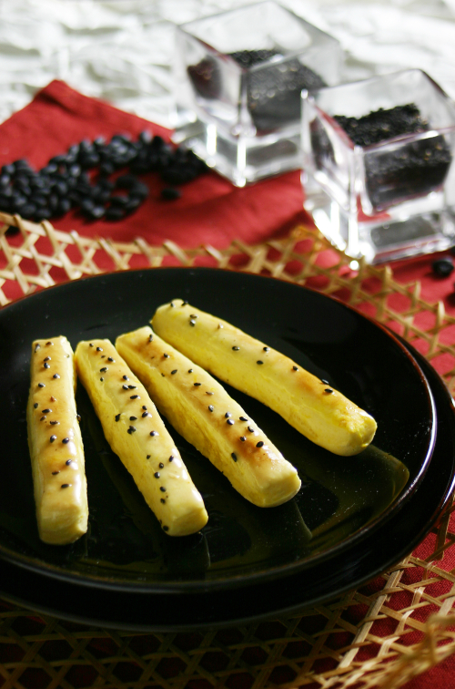 | ■검은깨 스틱 재료- 검은깨 1큰술씩, 시럽 약간, 발효 반죽 재료(밀가루 2컵, 버터 1큰술, 인스턴트 이스트 1큰술, 데운 우유 3/4컵, 소금 약간, 설탕 1/2큰술) 만드는 법 ① 분량대로 발효 반죽을 만들어 충분히 치댄다. ② 발효 반죽을 굵은 밤알 크기로 자른 뒤 2㎝ 굵기의 스틱으로 만든다. ③ 오븐 팬에 버터를 바르고 약간의 밀가루를 얇게 뿌려준다. ④ 오븐 팬에 ②의 스틱을 서로 들러붙지 않게 나란히 놓는다. ⑤ 빵 위에 시럽을 바른 다음 검은깨를 골고루 뿌린다. ⑥ 오븐 토스터에 넣어 노릇하게 굽는다. |