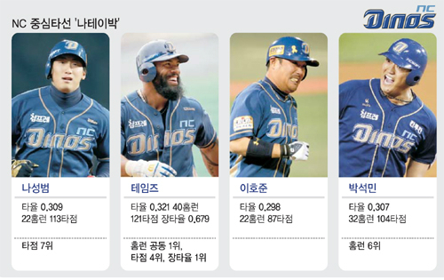 지난 시즌 MVP 테임즈는 올해에도 40홈런으로 최정(SK)과 함께 공동 홈런왕에 오르며 리그 최강의 좌타자로 군림했다. 플레이오프에서도 내내 침묵하다 4차전서 0-1로 뒤진 4회 동점 솔로포로 예열을 마쳤다. FA 최고액(96억원)에 NC에 새둥지를 튼 박석민은 플레이오프에서 단 2개의 안타에 그쳤으나, 그게 모두 승리를 결정짓는 결승타였다. 박석민은 KBO리그 역대 최초의 7년 연속 한국시리즈 출전 선수이자 플레이오프 MVP로서 한국시리즈에서도 그 활약을 이어간다는 각오다. 나성범도 4차전서 멀티히트를 가동하며 타격감을 끌어올렸고, ‘맏형’ 이호준도 고비마다 해결사 노릇을 해줄 수 있을 것으로 기대된다.