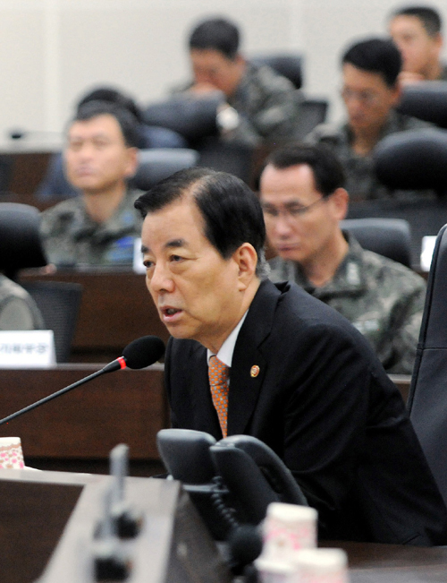 | 한민구 국방부 장관이 28일 합참 작전회의실에서 육·해·공군 참모총장을 비롯한 전군 주요 지휘관들과 화상회의를 하고 있다. 한 장관은 회의에서 북한이 국면 전환을 노린 군사적 도발에 나설 수 있다며 전군에 만반의 대비태세를 주문했다. 국방부 제공 |