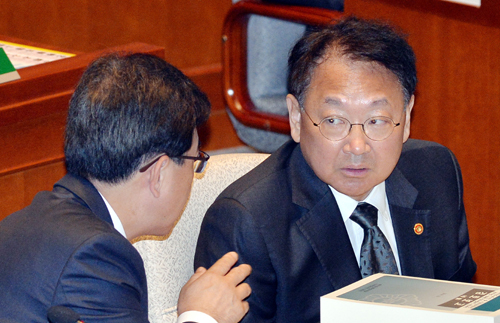 | 유일호 경제부총리 겸 기획재정부 장관(오른쪽)이 28일 국회에서 열린 예산결산특별위원회 전체회의에서 송언석 기재부 2차관과 답변 내용을 상의하고 있다. 이제원 기자 |