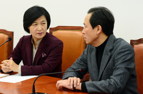 | 더불어민주당 추미애 대표(왼쪽)와 우상호 원내대표가 30일 오후 국회에서 열린 긴급 최고위원 간담회에서 ‘최순실 게이트’ 대응방안을 논의하기에 앞서 이야기를 하고 있다. 남정탁 기자 |