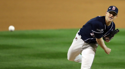 | 두산 보우덴이 1일 창원 마산구장에서 열린 2016 프로야구 한국시리즈 3차전 NC와의 경기에서 선발로 등판해 역투하고 있다. 창원=연합뉴스 |