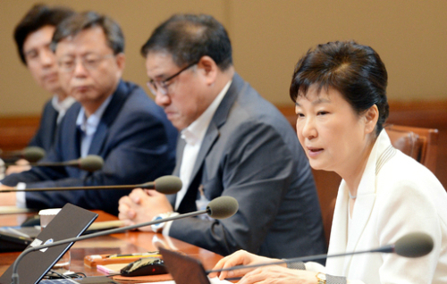 친박계들은 그동안 박 대통령에게 듣기 좋은 말만 하면서 충성 경쟁에 골몰했다. 지난해 7월 박 대통령과 새누리당 지도부의 청와대 회동. ‘신박’으로 변신한 원유철 원내대표는 “민생과 경제를 살리는 데 코피를 흘리겠다”고 다짐했다. 박 대통령은 “든든하다”고 기뻐했다.