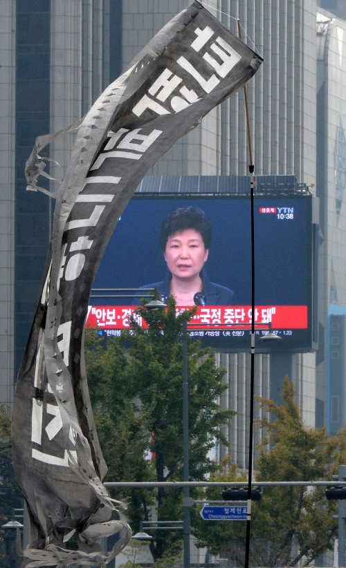 [포토] 거리에서 보는 담화문 발표 입력 : 2016-11-04 18:39:08 수정 : 2016-11-04 18:39:07 구글 네이버 유튜브 4일 오전 서울 종로구 광화문 네거리의 대형 전광판에 박근혜 대통령의 ‘최순실 게이트’ 관련 대국민 담화문 발표가 방송되고 있다. 하상윤 기자 Copyright ⓒ 세계일보. 무단 전재 및 재배포 금지 Cube 하상윤