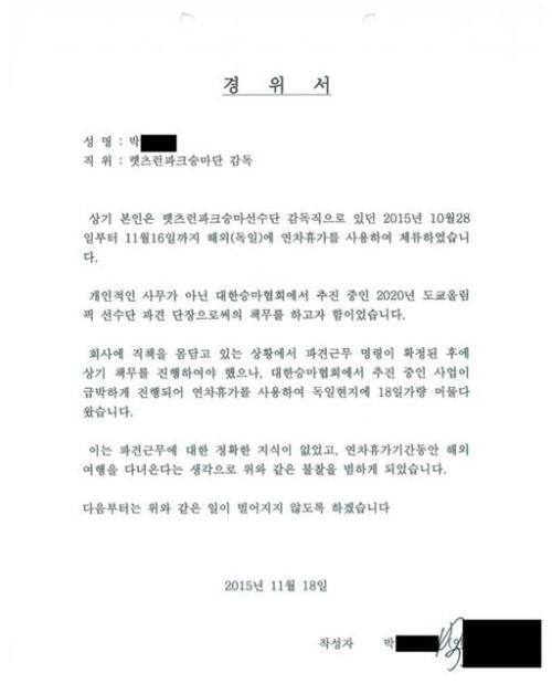 박 전 감독은 또 현 회장과 달리 김영규 부회장은 자신의 독일 파견을 적극 만류했다고 주장했다. 현 회장이 파견을 지시했지만 김 부회장이 출국 시기를 늦출 것을 계속 종용했다는 것이다. 박 전 감독은 독일 현지에서 최순실씨측으로부터 빨리 와달라는 요청이 계속되자 지난해 10월28일 휴가를 써서 독일로 떠났다고 밝혔다. 하지만 김 부회장의 지시로 11월18일 국내에 잠시 돌아왔는데 김 부회장은 어찌된 일인지 ‘독일 출국이 박 전 감독 자신의 독단적 판단으로 이뤄진 것’이라는 내용으로 경위서를 쓰라고 요구했다고 박 전 감독은 주장했다. 박 전 감독은 “부회장은 어쨌든 간에 정유라쪽이랑 엮이면 회사가 안 좋다는 생각을 하고 있었다. 경위서에 내 마음대로 간 것 같이 써달라고 요구받았다”고 당시 상황을 설명했다.