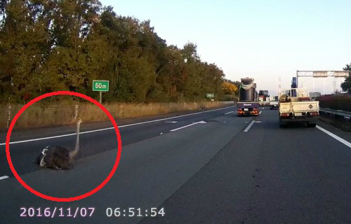 난데없이 고속도로에 나타난 타조를 보고 옆을 지나던 운전자들이 상황을 경찰에 신고. 포획 장비를 챙겨 들고 출동한 경찰은 타조를 잡기 위해 노력했지만 타조가 워낙 빠르고 민첩하게 도망치는 바람에 한참 동안 애를 먹었고, 타조가 지치고 나서야 경찰에 포획돼 통행이 재개될 수 있었다.