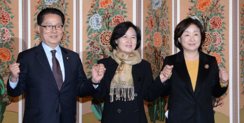 더불어민주당 추미애 대표, 국민의당 박지원 비상대책위원장, 정의당 심상정 대표가 9일 서울 여의도 국회 사랑재에서 열린 야3당 대표 회담에서 손을 잡고 포즈를 취하고 있다. 이제원기자 |